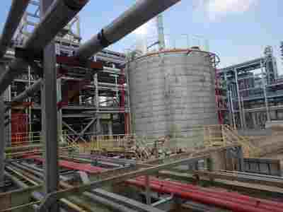 由于一期工程MMA装置自运行以来,存在技术瓶颈,未能实现长周期达产运行,浙江石油化工有限公司委托上海蓝科石化环保科技股份有限公司进行脱瓶颈技术改造工艺优化设计,在原9万吨MMA装置的基础上主要优化反应与精制单元。MMA反应单元:优化进料,增设酯化进料罐,更换酯化反应釜及配套设施,拆除酯化回流冷凝器,增设粗MMA初冷器、酯化气液分离罐,调整酯化反应系统阻聚剂加入点,拆除并更换相关设备设施;MMA精制单元:拆除立式MMA/水分离罐并换新,改造脱水塔、脱水塔气相增设后冷器,拆除相应储罐并增设低沸物泵、回流泵,拆除并更换相关设备设施,以实现装置的长周期稳定运行。